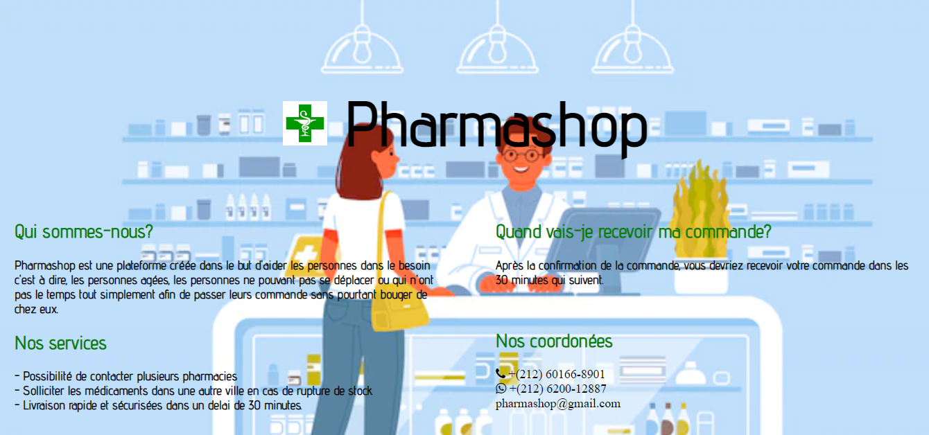 Pharmashop est une plateforme créée dans le but d'aider les personnes dans le besoin c'est à dire, les personnes agées, les personnes ne pouvant pas se déplacer ou qui n'ont pas le temps tout simplement afin de passer leurs commande sans pourtant bouger de chez eux.